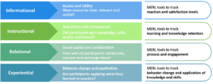MEL approach: Tools to track behaviour change and application of knowledge and skills. This often requires longer-term follow up, observations in practice settings, case studies, and documentation of concrete changes in how people work.