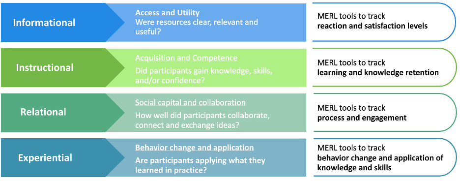 Each modality group contributes to capacity strengthening in different ways and therefore requires a different MEL approach. Figure 2 illustrates how each modality group aligns with a particular MEL focus and outlines the key question guiding our evaluation.