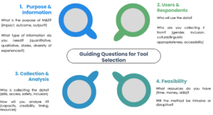 Our framework is based on a set of guiding questions designed to ensure MEL tool choices are purposeful, credible, inclusive, and feasible (see Figure 3). These questions are adapted from INTRAC’s Toolkit for Small NGOs (Garbutt, n.d.) and have been tailored to the context of the CS Hub’s Responsive Fund projects.