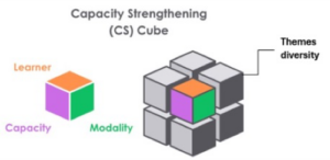 The Hub approaches capacity strengthening through a variety of means and modalities. In the last three years, we have co-designed and delivered tailored workshops, for example on knowledge brokering, gender equality and inclusion (GEI) or communication and dissemination. To support early- and mid-career colleagues, the Hub organised a seasonal school to offer an immersive, experiential learning environment to strengthen a variety of fundamental capacities around critical thinking in climate adaptation research. Depending on the intended learning objective (i.e. capacity to be strengthened) as well as the learning group, the Hub chooses a suitable modality (e.g. in-person, virtual, pre- or post-engagements). To ease the conceptualisation of activities, PlanAdapt is referring to the CS Cube.