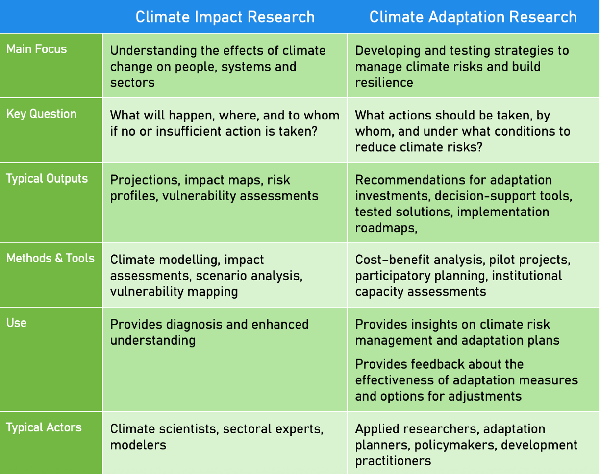 Climate impact research focuses primarily on understanding how climate change affects physical systems, ecological processes, economies, and societies. It often includes climate modelling, impact projections, vulnerability analyses, biophysical assessments, and quantitative risk estimations. Much of this work is conducted within academic and scientific institutions and synthesised in global assessments such as the IPCC Assessment Reports – Working Group II on Impacts, Adaptation and Vulnerability. Whereas climate adaptation research, where PlanAdapt positions itself, is concerned with how societies can respond to these impacts: how decisions are made, how institutions evolve, how policies are designed, how behavioural and social change happens, and how adaptation actions can be effective, fair, context-appropriate, and sustained. Adaptation research addresses governance, power, justice, learning, policy processes, finance mechanisms, adaptation pathways, and implementation challenges. It is inherently applied, transdisciplinary, and strongly embedded in practice — as increasingly reflected in scholarly communities such as the Adaptation Futures or Adaptation Research Alliance network and collaborative initiatives like Adaptation Without Borders.